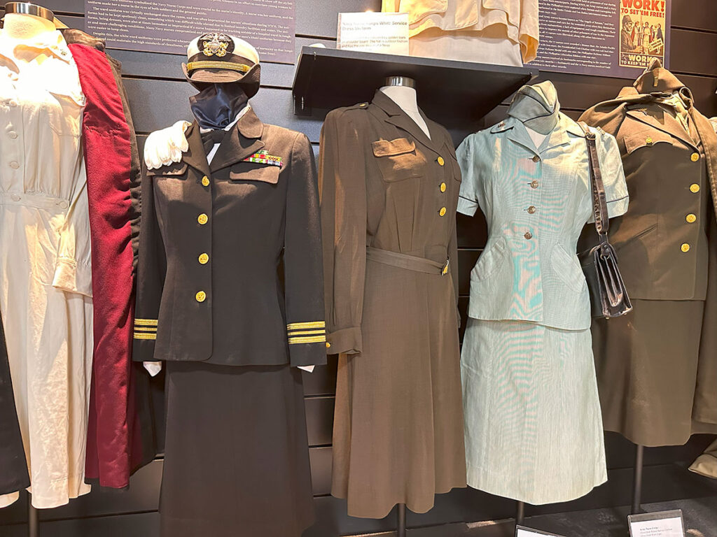 We are honored to display a large collection of women’s service uniforms, including those worn by WWI Navy Yeoman (F), WWII Women Air Force Service Pilots, USMC Women Reserve, WAVE, SPAR, WAC, and Army and Navy Nurses. A special highlight is our display of service uniforms from families that served—husbands and wives, brothers, and fathers and daughters.