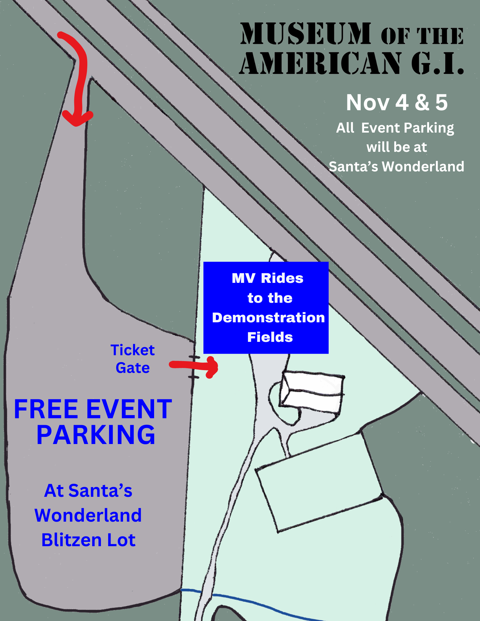 Parking is FREE at Santa’s Wonderland’s Blitzen Lot. From there, you simply enter the museum grounds through the admission tent. Upon entering the museum property, you will ride in a WWII 2 1/2 ton CCKW or modern HUMVEE to the reenactment fields where all the activities will occur.