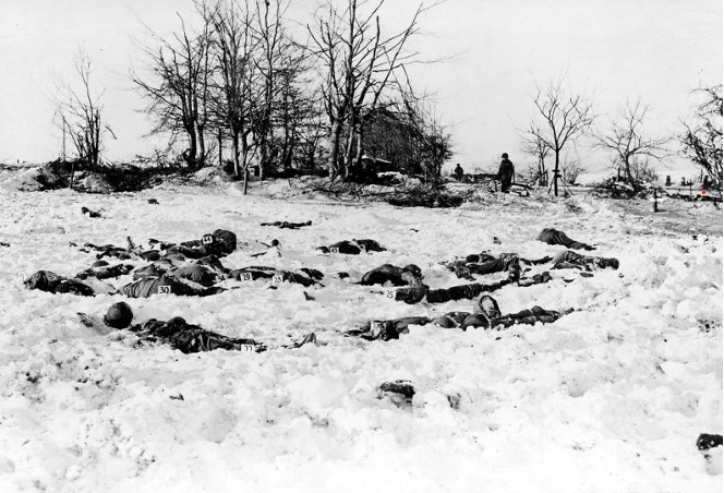 As Kampfgruppe Peiper continued to move west, 113 American prisoners were captured and gathered in a field near the crossroad. Unexpectedly, the Kampfgruppe Peiper opened machine-gun fire on the American prisoners, killing them where they stood. The SS troops even walked among the bodies shooting anyone who appeared alive. 84 American servicemen were killed in what became known as the Malmedy Massacre, but despite the efforts of the Germans, a number of POWs survived by playing dead and escaped to Malmedy, which was still in American hands. The bodies of those who died at the Baugnez crossroads lay in what was to become a no man’s land until January 14, 1945.